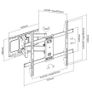 Montagem | | | Capacidade máxima de peso | 60 kg | | Tamanho mínimo da tela | 94 cm (37") | | Tamanho máximo da tela | 2,03 m (80") | | Tipo de montagem | Parede | | Suporte de interface de montagem (mín.) | 200 x 200 mm | | Suporte de interface de montagem (máx.) | 600 x 400 mm | | Interface de montagem em painel | 200 x 200,300 x 200,300 x 300,400 x 200,400 x 400,400 x 300,600 x 400 | | Número de telas suportadas | 1 | Ergonomia | | | Alcance da bandeja | -60 - 60° | | Ajuste de inclinação | Sim | | Ângulo de inclinação | -15 - 5° | | Distância até a parede (máx.) | 40,2 cm | | Distância até a parede (min) | 5,8 cm | Peso e dimensões | | | Largo | 710 milímetros | | Profundidade (máx.) | 43 cm |
